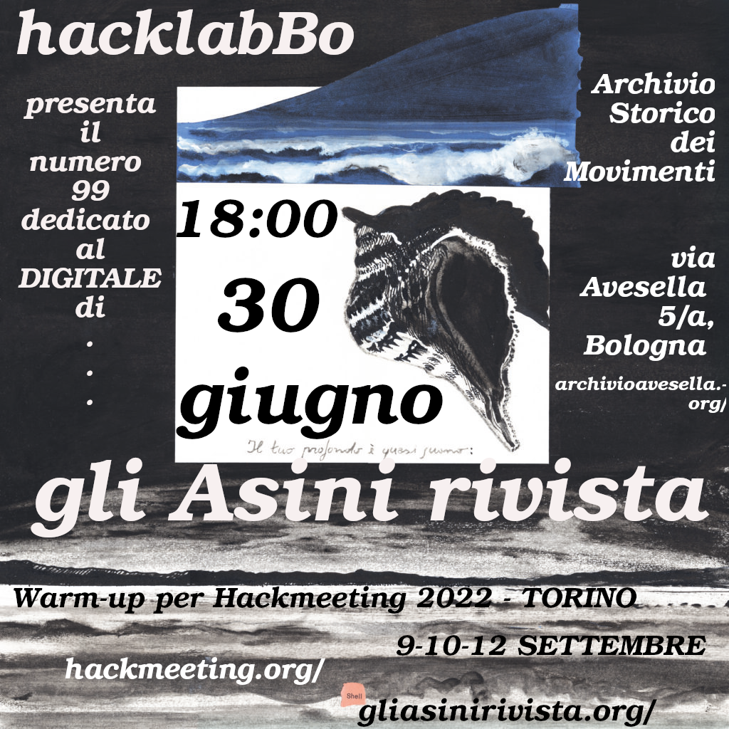 30 Giugno h18:00, @Archivio dei movimenti di via Avesella, Bologna. Presentazione del numero di Maggio 2022 di Gli Asini Rivista dedicato al DIGITALE insieme alla redazione, alle autrici ed ad Hacklabbo: https://gliasinirivista.org/rivista/maggio-99-2022/